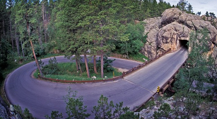 Iron Mountain Road, uma estrada sinuosa projetada para revelar vistas panorâmicas do Monte Rushmore